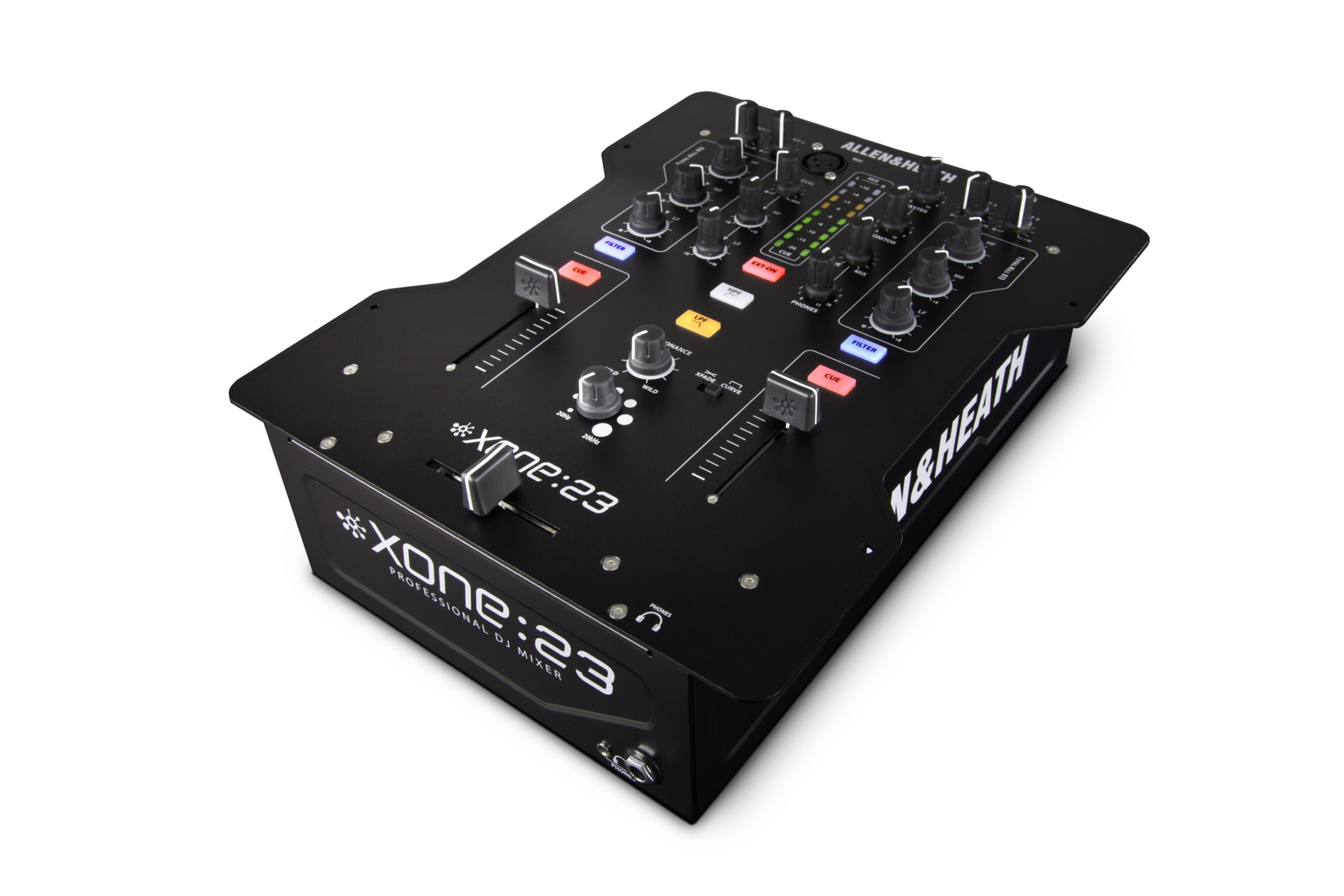 Xone:23 is a 2+2 channel DJ mixer packed with pro features that would normally be found in the booth of a top-rated club, including an enhanced version of the legendary Xone filter with resonance control, VCA faders, 3 band total kill EQ, illuminated switches, crossfader curve selector and styling inspired by the flagship Xone:DB4.