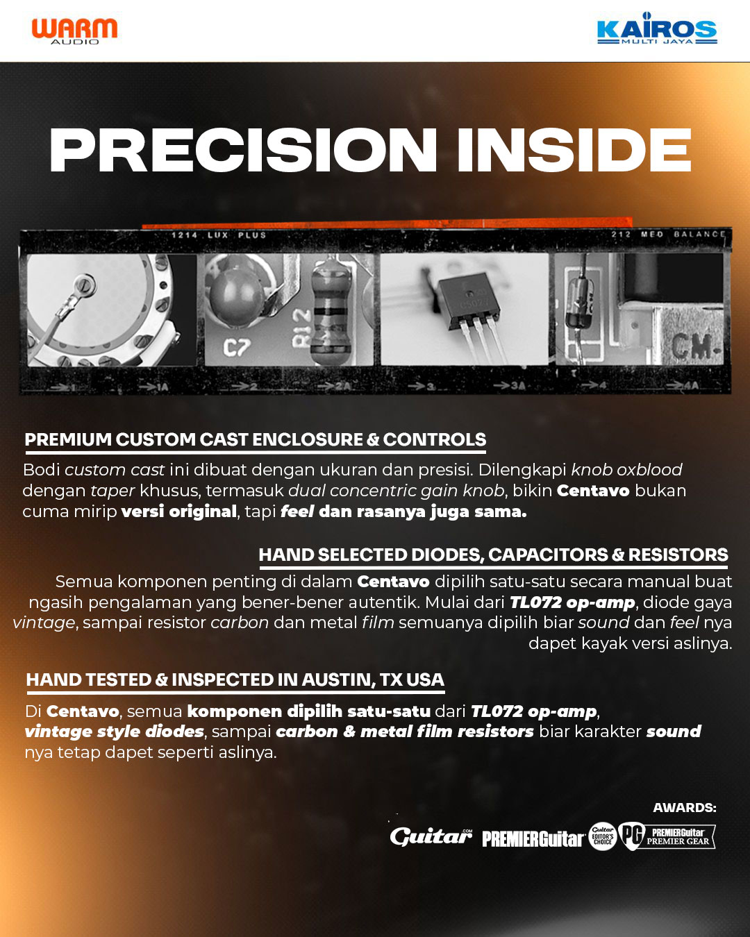 Warm Audio Centavo merupakan rekreasi presisi yang menghidupkan kembali karakteristik salah satu sirkuit overdrive paling ikonik dalam sejarah gitar elektrik. Kekuatannya terletak pada kemampuannya memberikan dorongan harmonik yang kaya tanpa menutupi karakter asli gitar maupun amplifier Anda.